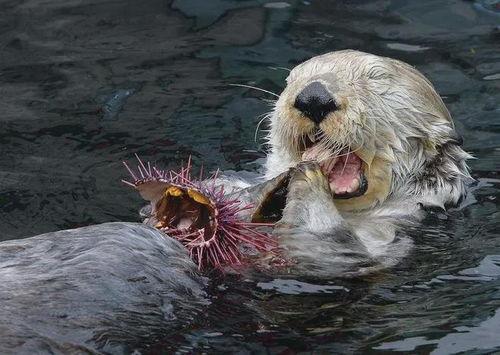 海獭吃瓜的技巧可是一绝!它们的前肢就像一双灵巧的手,能够轻松地抓住海胆。而且,海獭的牙齿非常特别,既锋利又柔软,能够轻易地咬破海胆的外壳。